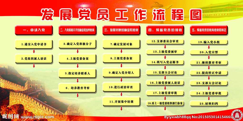 17.审定发展对象:党委审定后,由组织部及时通告党支部履行入党手续。主持人(单位)党委。