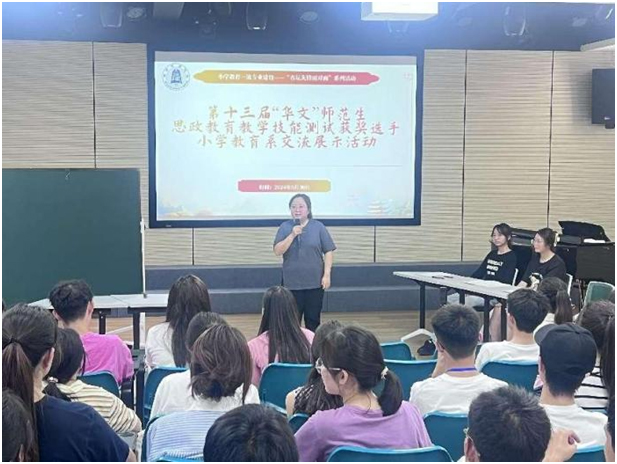 活动最后,小学教育系系主任景艳老师对六名参赛选手的展示进行总结,希望同学们在观摩学习优秀获奖选手的教学展示中,借鉴优秀教学经验,从教学设计能力和教学技能两个方面提升教学实践能力,并勉励同学们提高自身专业素养,在未来的专业技能竞赛中取得佳绩。