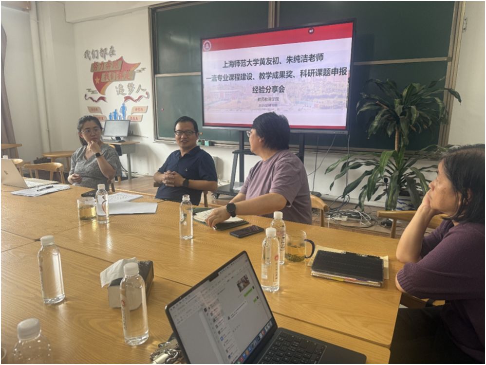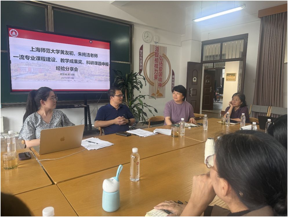 2025年9月10日15:00,在12教303会议室开展一流课程建设、教学成果奖或科研课题申报经验分享会。在课程建设方面,黄友初教授就一流课程的建设、教学成果奖的申报以及科研课题的经验进行了分享,并着重强调了资料素材的积累、师资团队的建设以及教学模式的构建,同时突出了课程的独特亮点和内容结构的重要性。朱纯洁副教授认为,课程建设应提前进行整体规划,提前编写教材、组建团队,并建议从校级到市级逐级进行申报,同时要注重在线资源的建设。在科研课题申报方面,两位专家一致认为,课题的选择应具有吸引力和研究价值,强调了成果积累和文本质量的重要性。教师教育学院的老师们与两位专家就相关议题进行了深入的交流。