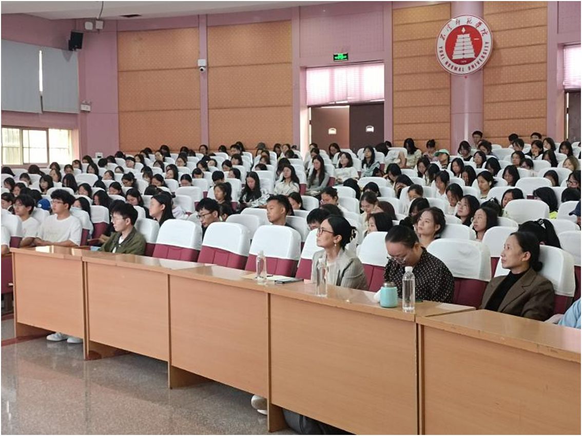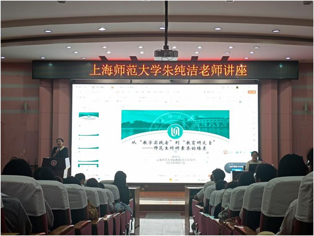 2025年9月11日上午10:00,在科学讲堂,朱纯洁副教授作《从“教学实践者”到“教育研究者”——师范生科研素养的培育》主题报告,朱老师从师范生科研能力的重要性、大学生参与社会实践的途径、提升社会调研能力的方法、实践经验与分享、总结与展望五个方面展开分析。通过朱老师的分享,同学们深刻理解了提升科研能力的必要性,并掌握了撰写科研报告的技巧,从而获得了宝贵的学术指导。