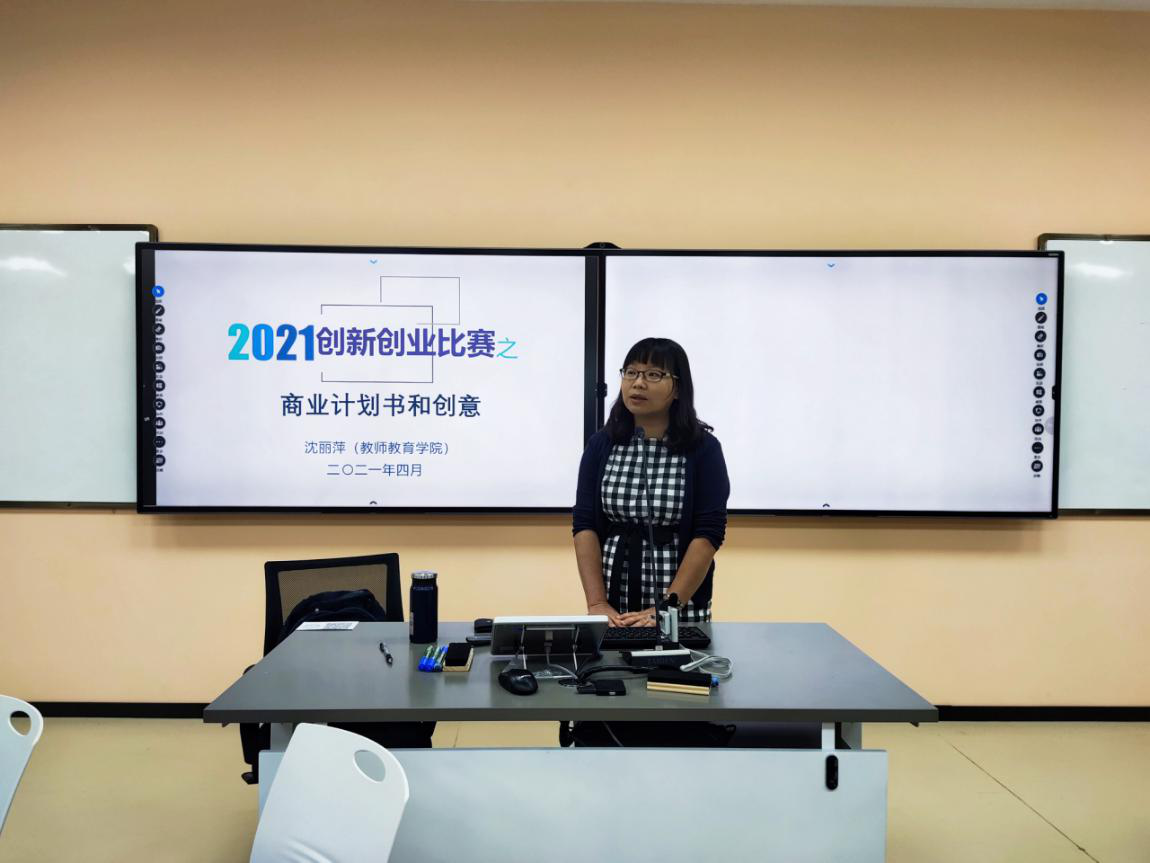 2021年4月8日下午19:00,教师教育学院副书记沈丽萍在12教103智慧教室作“2021创新创业比赛之商业计划书和创意”专题讲座,吸引了我院及商学院近130余名师生前来听讲。