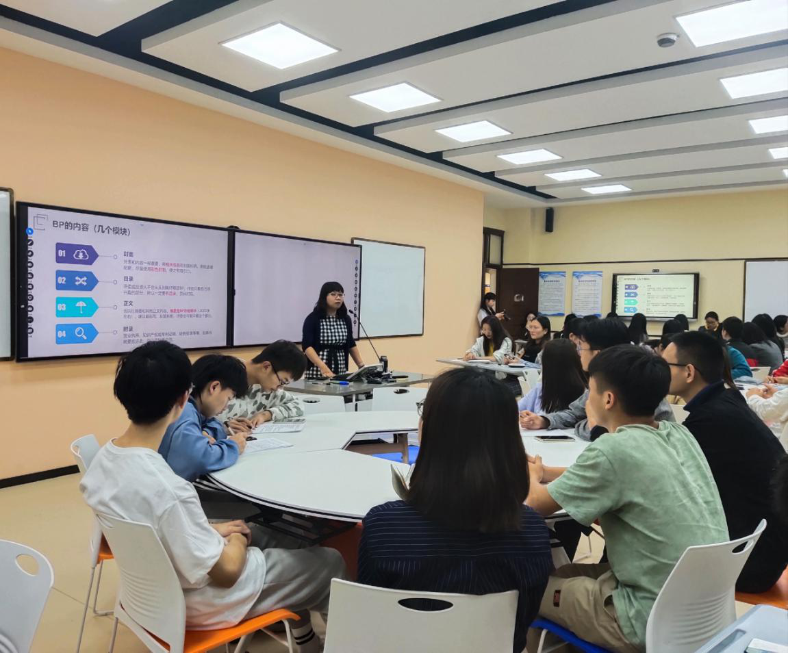 ➕”金奖项目为例,向听众展示优秀项目计划书和路演视频,直观的展示了大赛的全过程,阐述了“高教主赛道”和“红旅赛道”的区别,并凭借个人经验以及结合我校实际,给前来听讲的师生提出具有针对性的建议。
