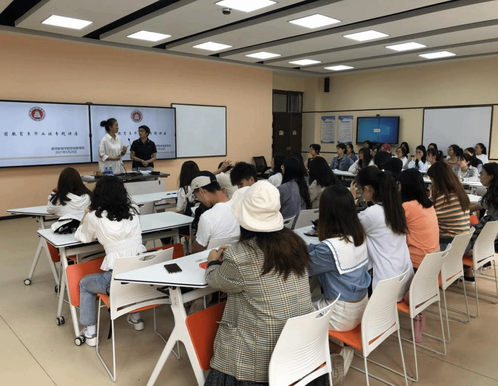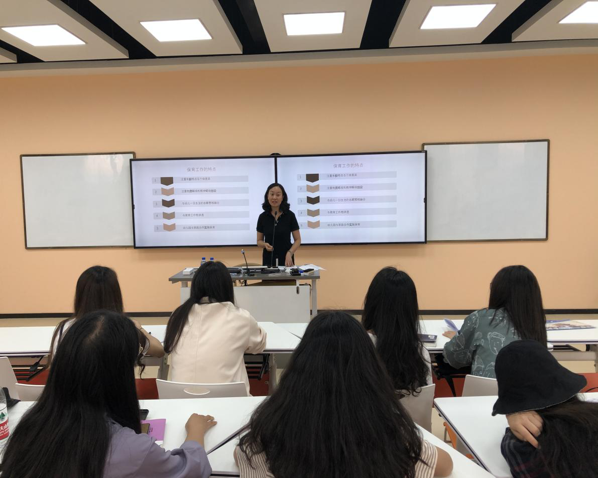 鼓励学前教育专业的学生要严格要求自己,努力塑造师德形象,刻苦学习专业知识,苦练扎实基本功,特别强调教师要有良好的师德师风,以爱为基,育人育才;玉溪市第一幼儿园副园长朱晓梅以《新时代背景下教师专业成长》为主题作报告,提出所有教师要构建终身专业成长模式,终身学习,终身发展,并要求必须从专业的角度来审视学前教育专业,响应习近平总书记提出的“四有”好教师标准;玉溪市第一幼儿园副园长杨芸就《幼儿园一日生活的组织与实施》为主题作报告,以幼儿园实际案例出发深入解读幼儿园一日生活流程;玉溪市第一幼儿园副园长邱莎就《保育员一日工作流程》为主题作报告,再次帮助毕业生强化幼儿园工作内容的认知。