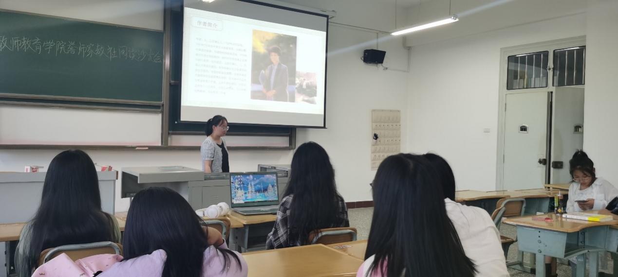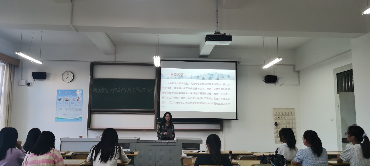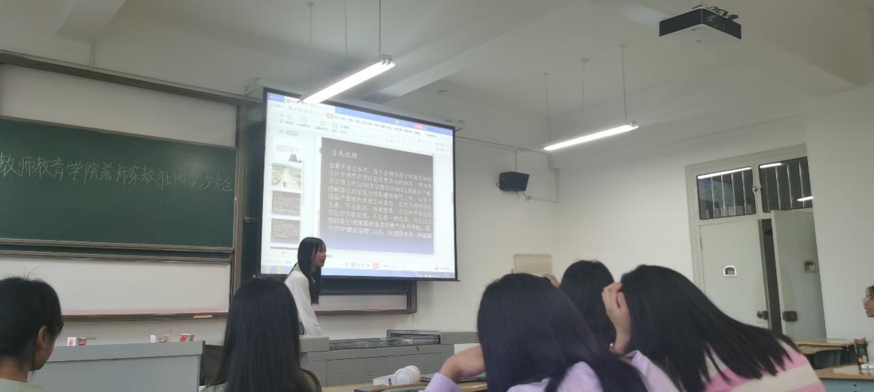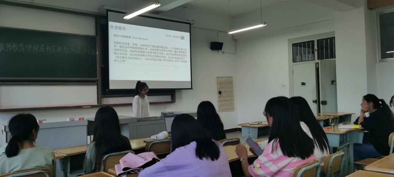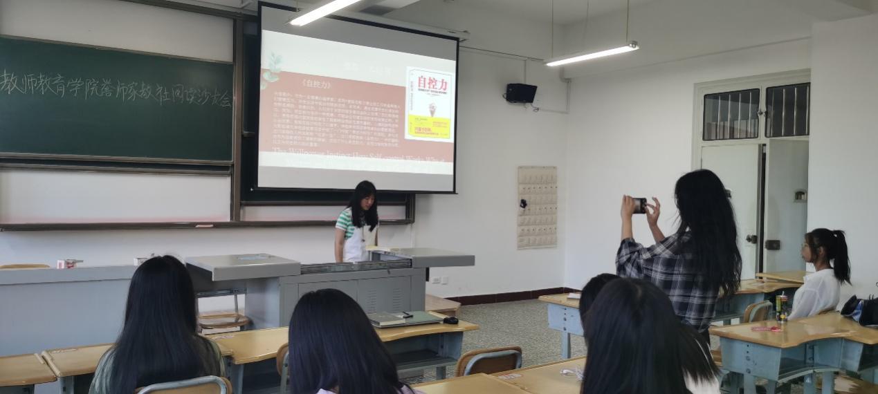 期间有五位同学:第一位李娜同学给我们分享了她说读的书《活着》和他自己的感悟,大家积极应和,并对他的发言给予热烈的掌声。第二位罗央央同学,她为我们推荐了她所读工具性书籍凯利麦格尼格尔的《自控力》,她认为相比休闲类书籍,工具类书籍对我们更加必要。第三位同学是董维婷,她推荐了塔拉·韦斯特弗的《你当像鸟飞往你的山》并谈及书中的思想对当代教育的影响。第四位同学是甘雪妮同学,她为我们推荐了于漪的《岁月如歌》,她不仅说了她的感悟而且系生活。第五位同学恰好推荐的也是塔拉·韦斯特弗的《你当像鸟飞往你的山》,但不同的是她将此书与《风雨哈佛路》做了对比突出次数主人公以家庭为中心。