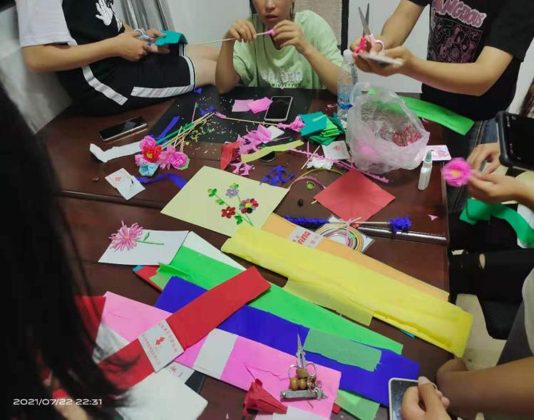 手工课以提升学生动手能力及艺术素养为目标,旨在促进孩子们在艺术上的动手实践能力,课程主要有手工和绘画组的同学负责,为调动小朋友们的积极性,头一天的晚上,两组成员都会在在一起“备课”,准备第二天要教给小朋友的成品。课上小朋友们对手工活动十分感兴趣,也愿意积极的参与到其中去,每一个小朋友看到自己亲手做出的作品,脸上露出的是开心的笑容。