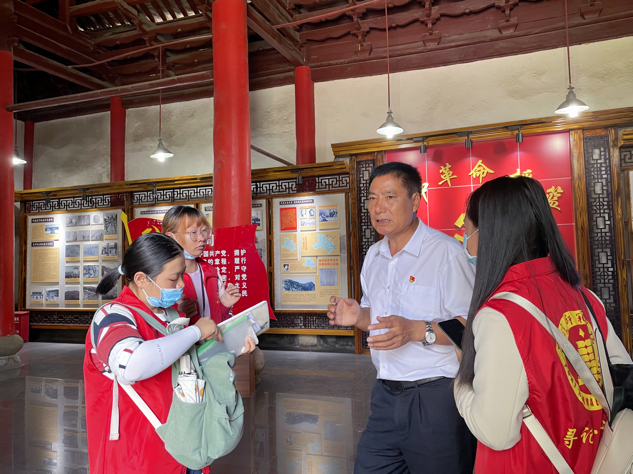 图为双江小学朱书记在峨山中学旧址给实践团成员讲解峨山中学被称为滇中革命摇篮原因