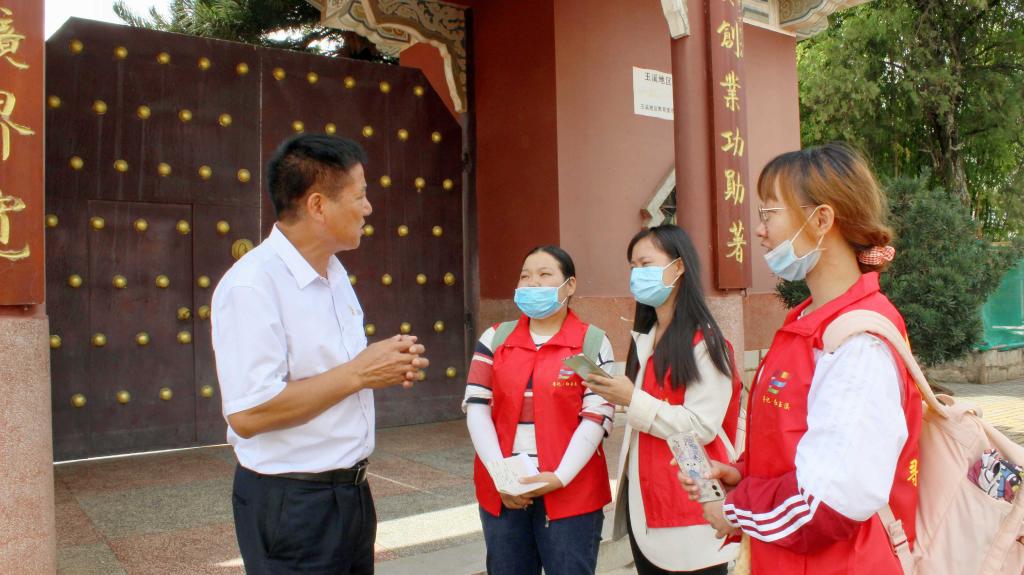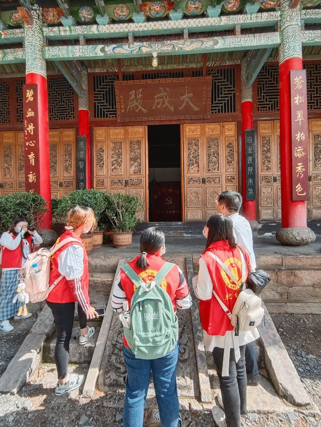 图为双江小学朱书记在峨山中学旧址的大成殿门前给实践团成员讲解红色故事