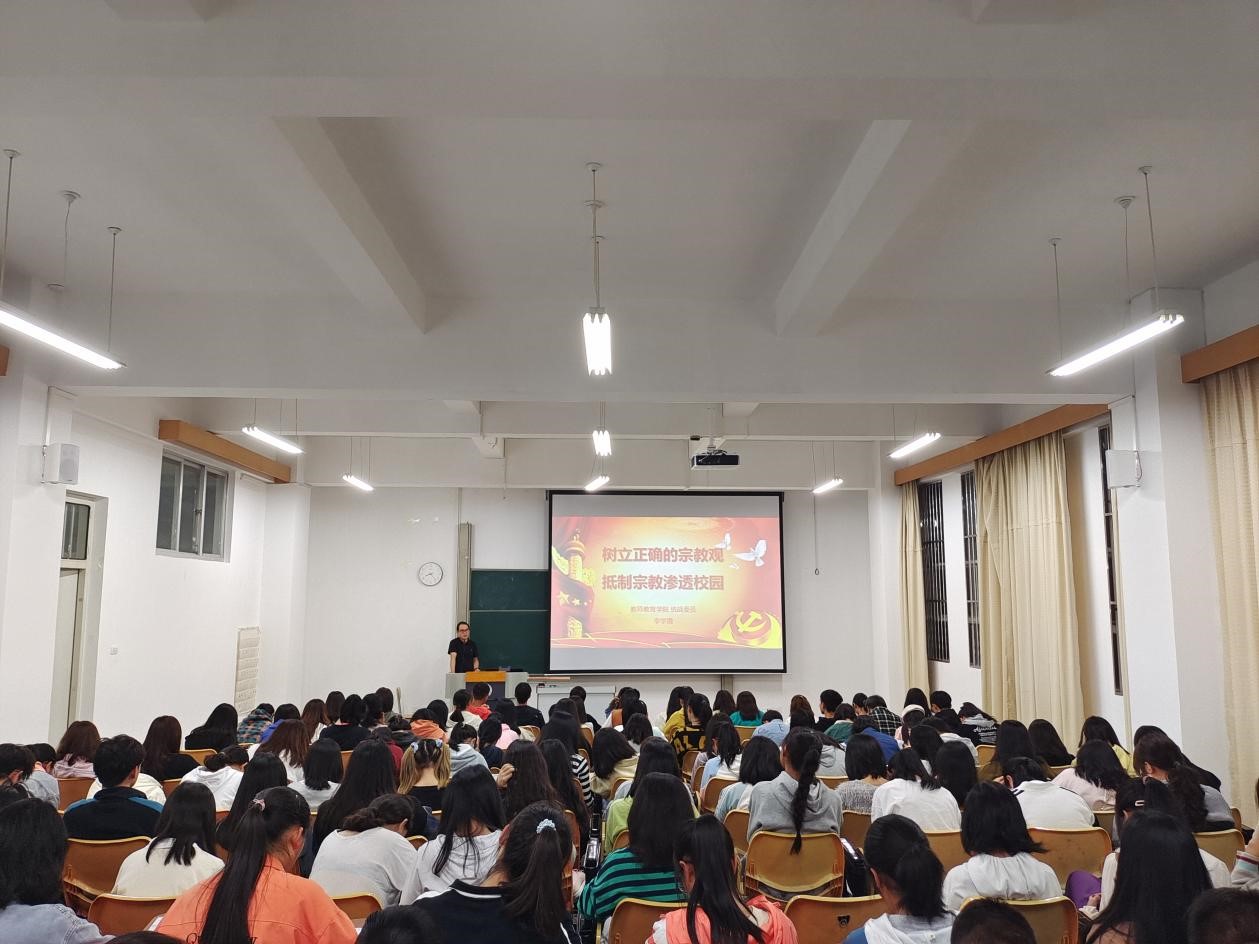 为帮助我院2021级新生树立正确的三观,提高对非正规宗教的警惕性并学会用正确的思想武装头脑,10月13日晚,教师教育学院统战委员李学孺在14教进行专题宣讲。