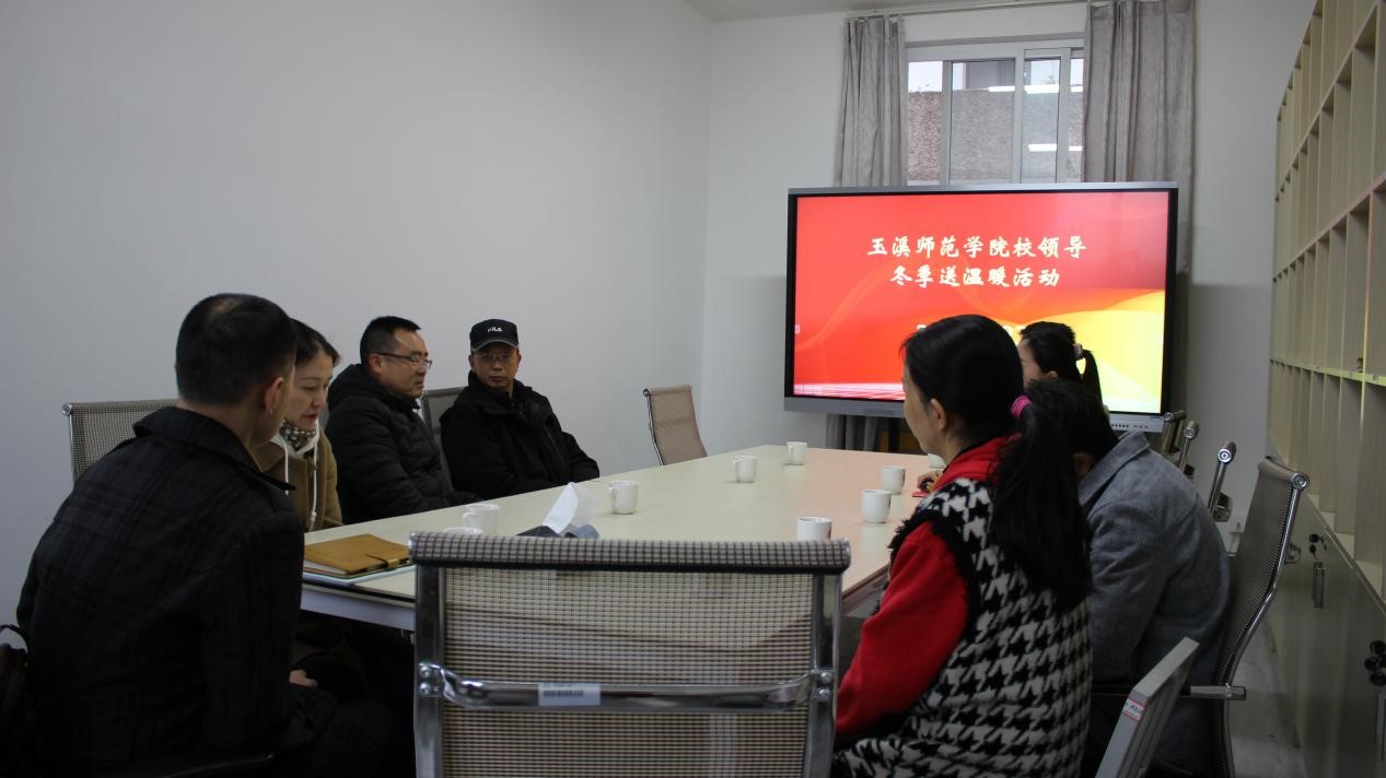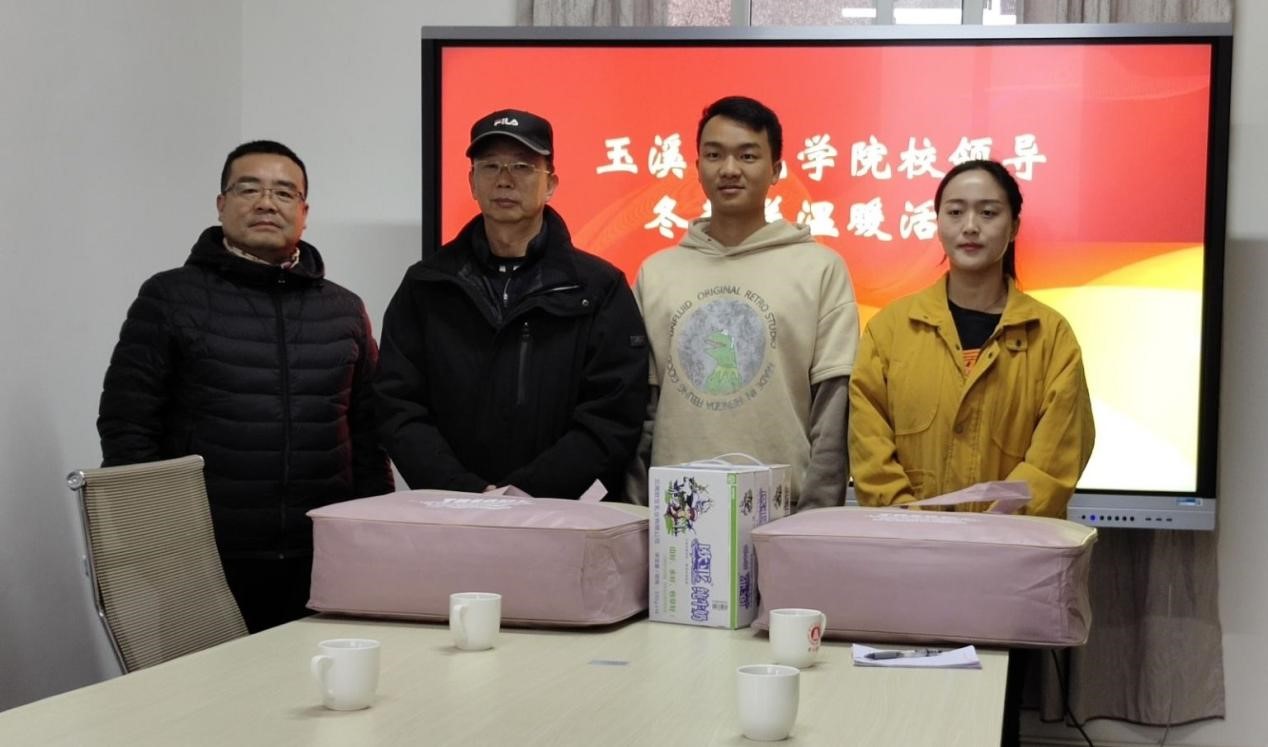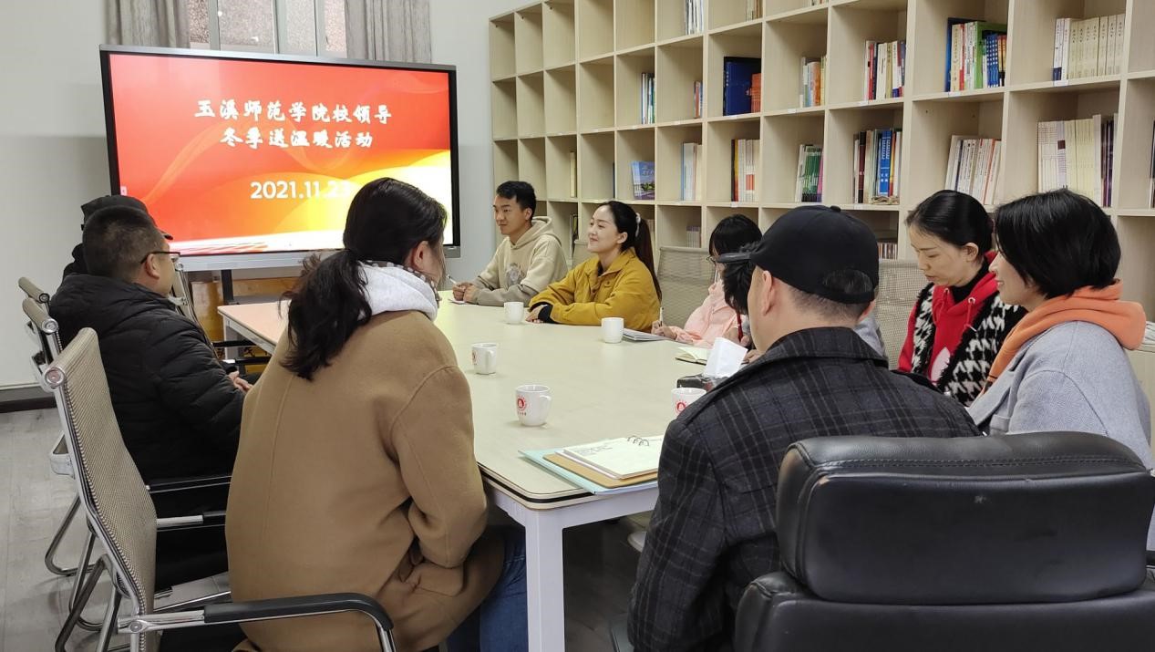 2021年11月23日下午16:30,玉溪师范学院校领导在学生处308室慰问教师教育学院学子,进行冬季送温暖活动。出席此次慰问活动的校领导有:校长马力,学生处处长张春霞,办公室副主任李杰,教师教育学院党委书记莫晓辉,校团委副书记余家赛。
