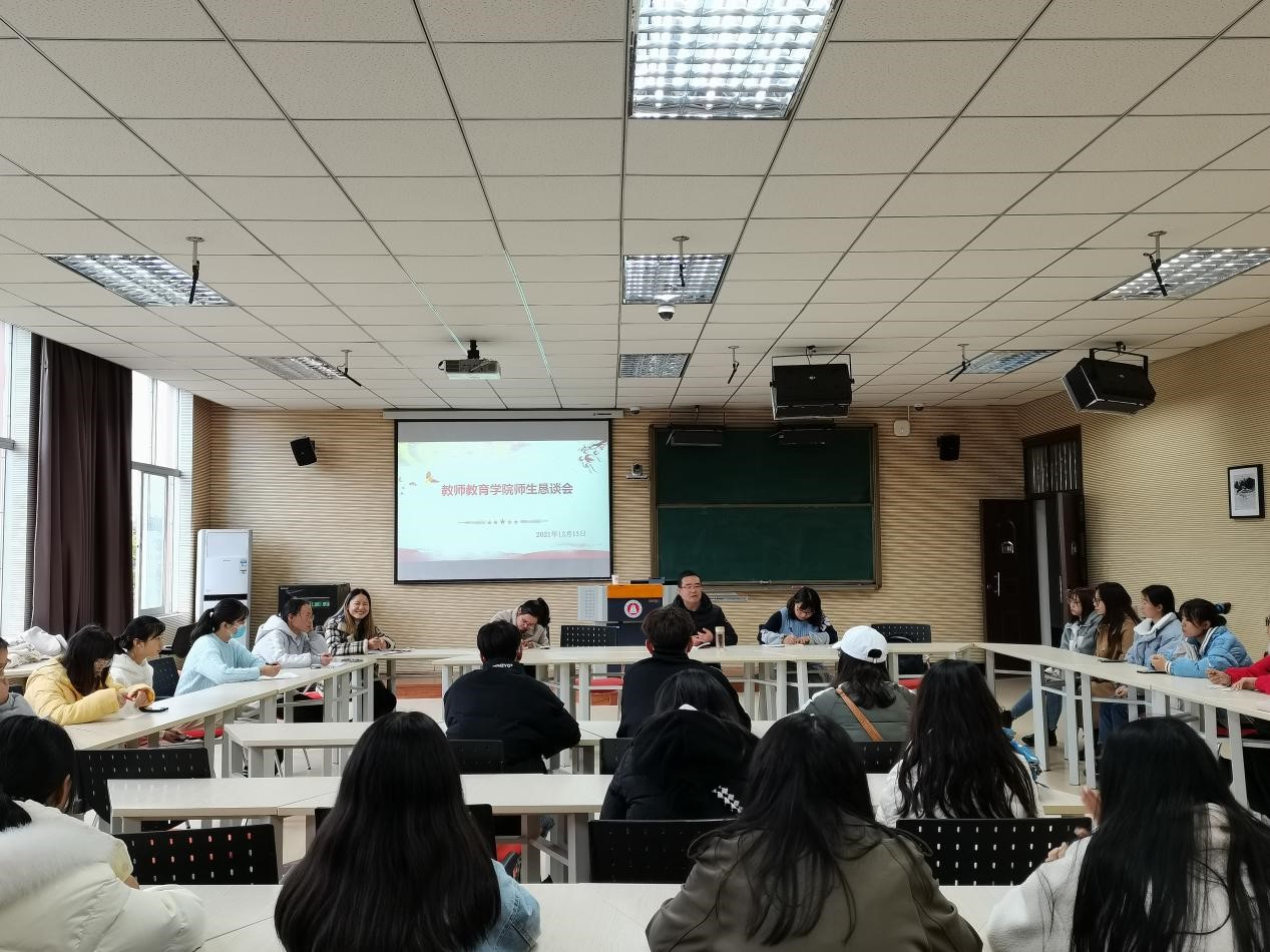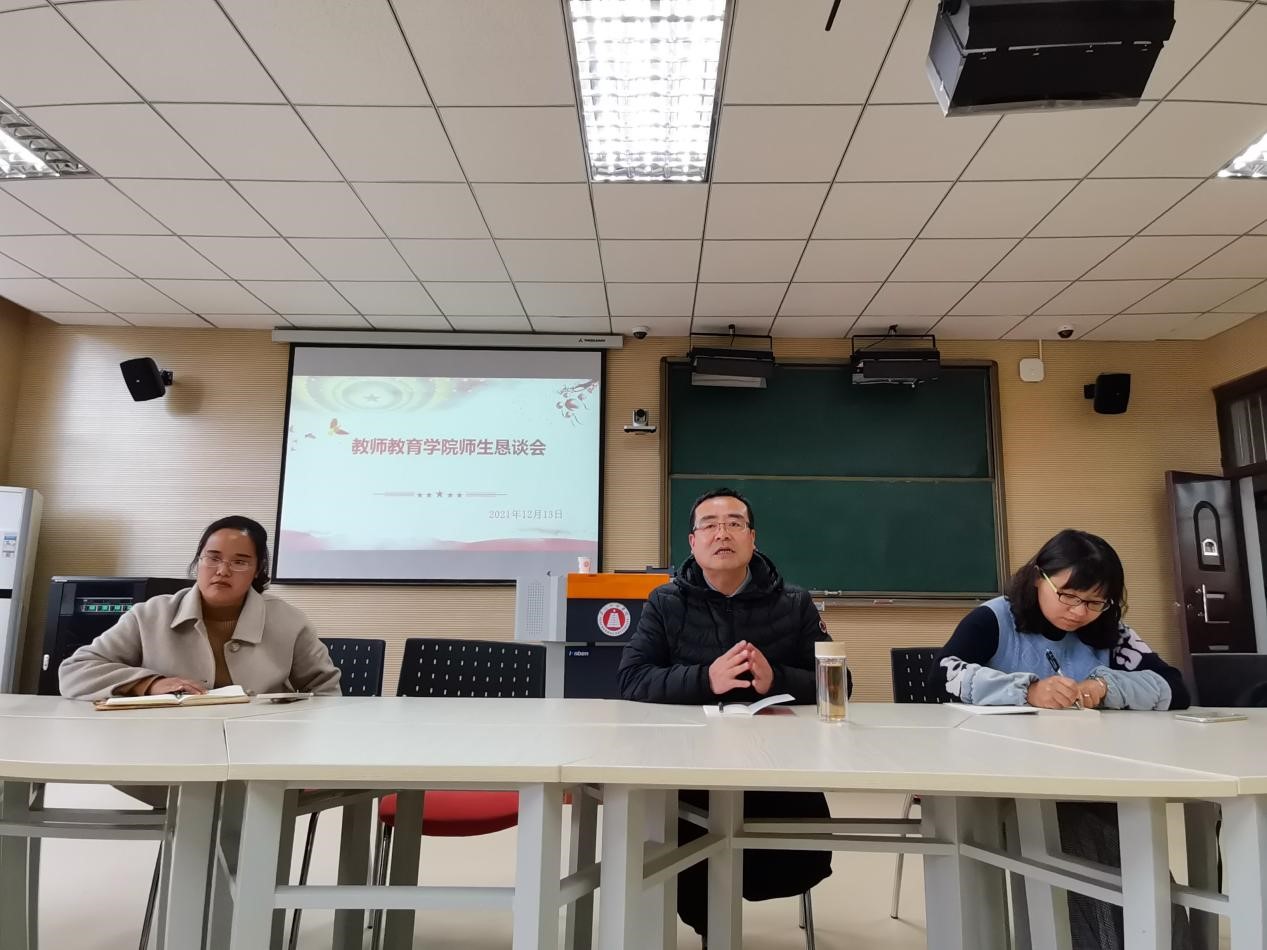 2021年12月13日下午4点,教师教育学院在第十二教学楼508教室召开12月师生恳谈会,学院党委书记莫晓辉,党委副书记沈丽萍,辅导员周银燕参加了本次会议;2019级、2020级、2021级各班的学生代表参加本次恳谈会。