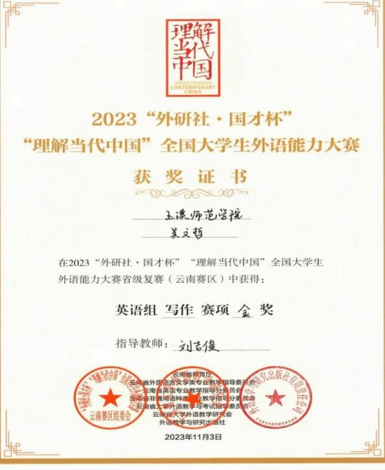 近日,2023“外研社·国才杯”“理解当代中国”全国大学生外语能力综合大赛云南赛区开赛。来自云南省内多所高校的300余名选手,以语言碰撞思维火花、以文字书写深刻观点、以思辨展现扎实技能,大放异彩,。经过激烈角逐,教师教育学院2023级学前本科2班吴文哲同学凭着扎实的基础和新颖的观点荣获英语写作赛项的金奖,成功晋级全国决赛,这是我校参加本赛事以来第二个获此殊荣的同学。