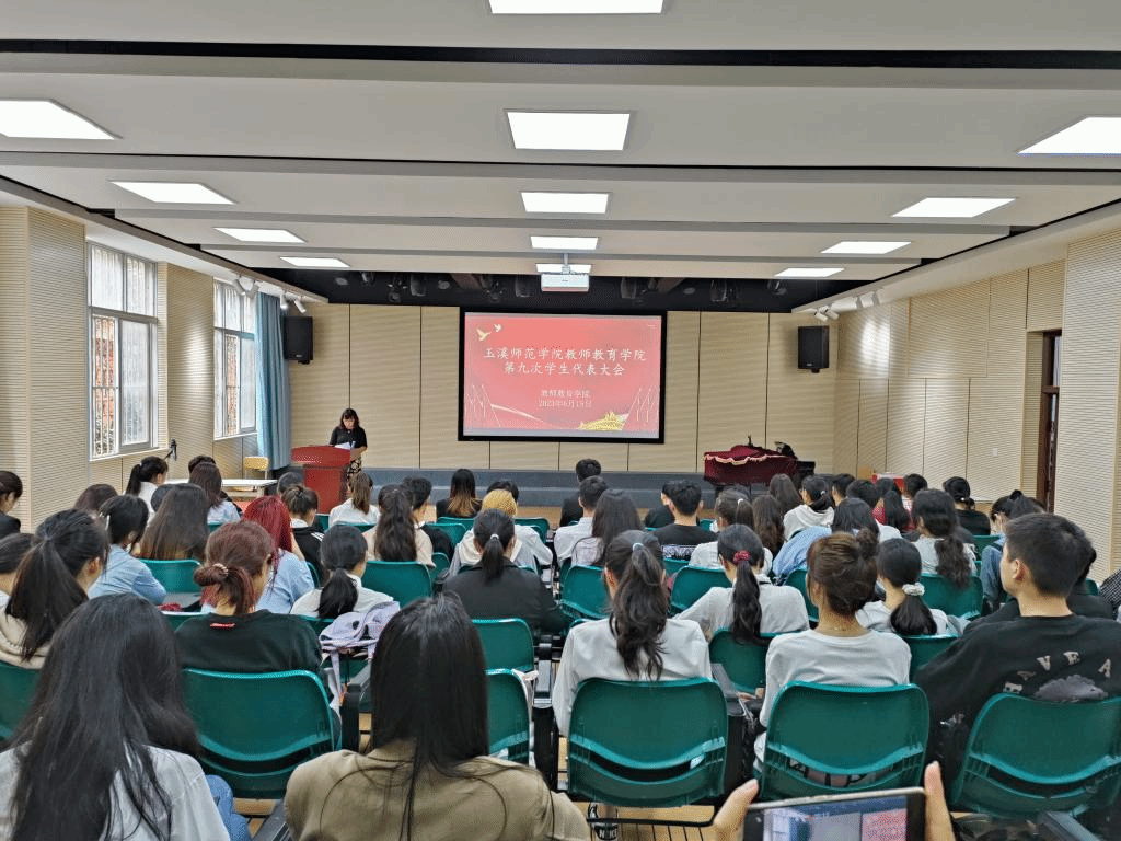 2023年6月15日玉溪师范学院教师教育学院第九次学生代表大会于12教1楼阶梯教室召开,本次参会人员有党委副书记沈丽萍老师、团委书记白丽娜老师以及学生会代表成员和各班班长、团支书。