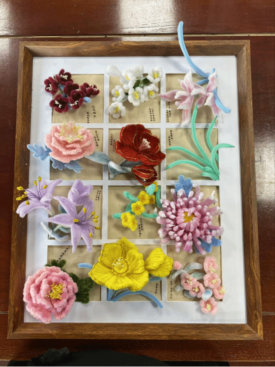 作品《十二花神》利用相框、扭扭棒等材料,经过剪、扭、粘等工序,将扭扭棒制作成各种造型的花朵,与分成多个小格子的卡纸组合,构成了一幅展现季节转换的美丽图画,表达了对自然的赞美和对时光流转的感悟。