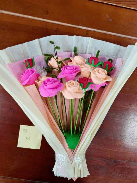 作品《彩笺花影寄情》采用超轻黏土、花瓣、皱纹纸、纸板等材料,通过巧妙的组合与精心的制作,黏土捏制的花朵栩栩如生,花瓣层次分明,色彩明丽,仿佛能嗅到缕缕芬芳,捧在手中能让人感受到满满的美好与幸福,传达出对生活的热爱之情。