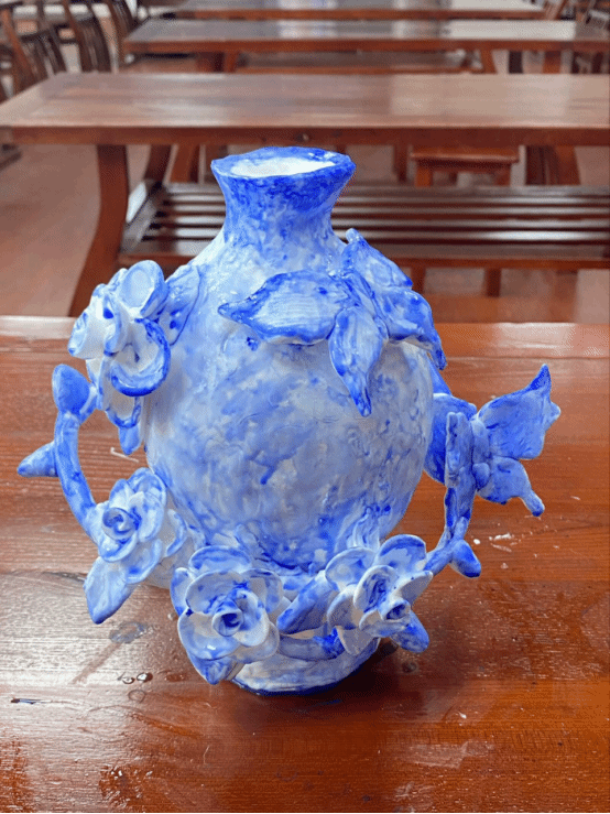 作品《幽蓝逸韵瓶》以白色超轻黏土和颜料打造出造型逼真、花纹细腻的青花瓷瓶,将传统元素与现代手工艺术巧妙融合。