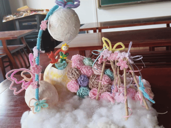 《小王子的玫瑰之约》以纸板为底,衍纸为花瓣,搭配悬浮的棉花云朵和扭扭棒花朵,球形装置让光影与花影相互映衬,营造出梦幻般的氛围。