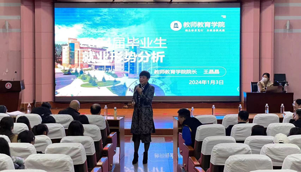为切实推进教师教育学院2024届毕业生就业工作,帮助毕业生充分了解当前就业形势、就业政策以便统筹安排及早谋划.1月3日晚19:00,教师教育学院在科学讲堂面向2024届毕业生召开毕业生就业形势宣讲会。教师教育学院院长王晶晶、副院长殷素梅、副书记沈丽萍、专任教师、2024届小学教育专业全体同学出席了本次宣讲会。