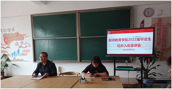 为鼓励学生积极应征入伍服役,提高兵员征集质量,推进国防和军队现代化建设,2022年5月5日,教师教育学院召开2022届毕业生征兵入伍宣讲会。会议由莫晓辉书记、沈丽萍副书记主持,教师教育学院2022届全体男生参加。