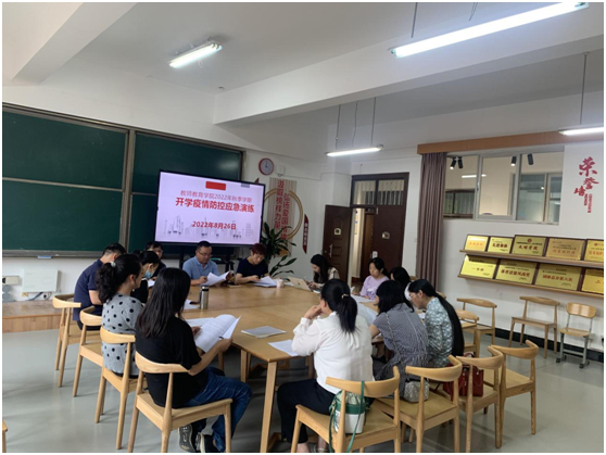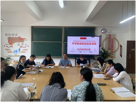 为切实做好2022年秋季学期学生返校疫情防控工作,及时发现、快速反应、精准管控和妥善处置校园突发新冠肺炎疫情,提高教师教育学院全体师生的应急处置能力,维护正常教育教学秩序,教师教育学院于8月26日下午开展疫情防控应急演练桌上推演。学院党委书记莫晓辉,党委副书记、院长王晶晶,党委副书记沈丽萍,全体班主任、办公室行政人员参与本次应急演练。