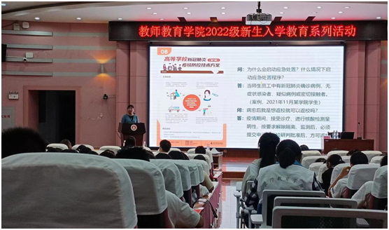 9月23日,教师教育学院在科学讲堂开展2022级新生入学教育系列活动讲座,本次讲座以“疫情防控知识、疾病预防教育”为主题,由教师教育学院党委副书记沈丽萍主讲,教师教育学院2022级全体学生聆听了讲座。
