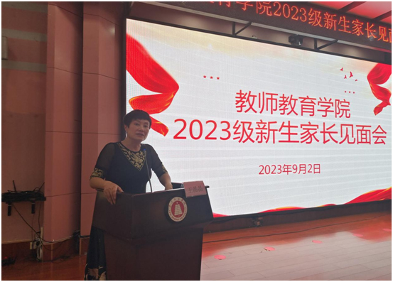 沈丽萍副书记以“家校协力,共赢未来”为主题,与家长们交流分享了如何家校协力,帮助新生尽快度过适应期,成长为一名合格的师范生。她指出,学校、学院、班级关心每一名学生的成长,教师教育学院实行党委领导下的“双线管理+朋辈领航”计划,想方设法帮助大一新生尽快度过适应期,但面对多元化、“00”后新生,还需要家长与学校构建起双向沟通渠道,建立沟通与共育的长效机制,共同承担起培养学生的重任。
