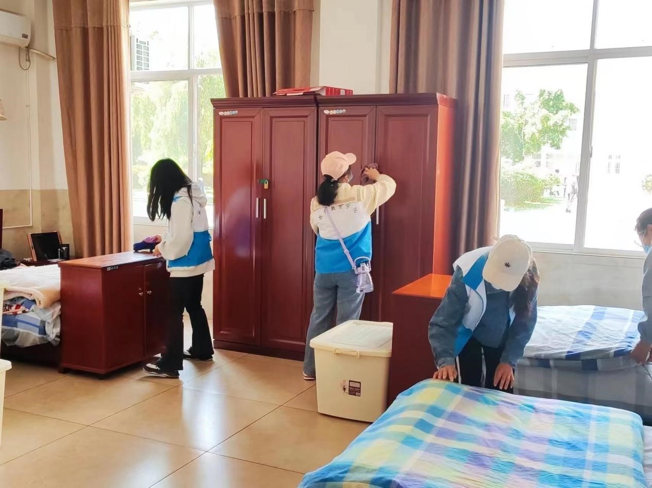 文艺演出结束,志愿者们分别来到了老年宿舍、食堂和活动场地,为老人们打扫卫生。