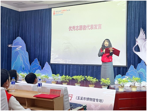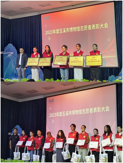 在2023年度玉溪市博物馆志愿者表彰大会上,教师教育学院“童语同音”志愿服务团被评选为玉溪市博物馆志愿者服务优秀团队,指导教师马米奇老师被评选为玉溪市博物馆优秀志愿者。马米奇老师发言时说到:“我在玉溪市博物馆分享着、学习着、治愈着、成长着,我想,我们每一名志愿者都是执火炬者,既照亮了来访观众,也照亮了我们自己的文化自信之路。”