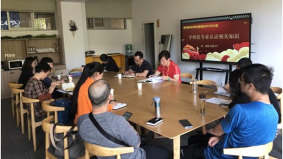 本次会议以“学习师范专业认证相关知识”为主题展开。教师教育学院副院长殷素梅围绕全国2021年师范类专业认证第一期学校培训的相关内容,针对认证政策、认证理念、认证标准和操作方法等给大家进行了具体讲解,详细为与会人员解读了师范专业认证标准。
