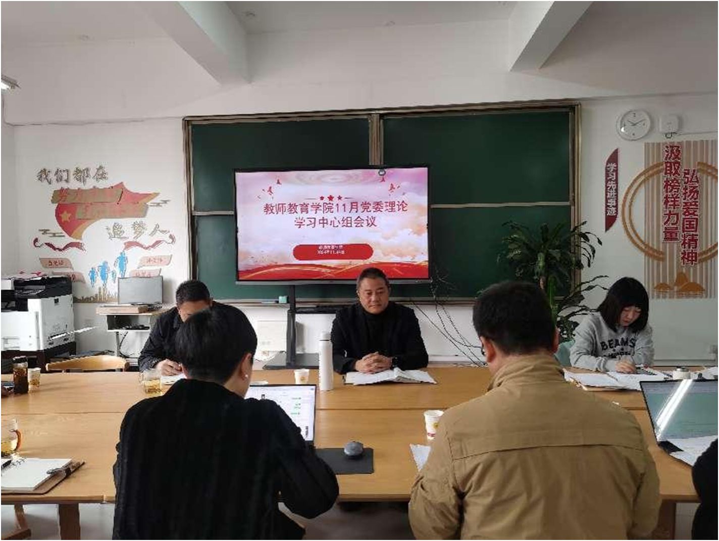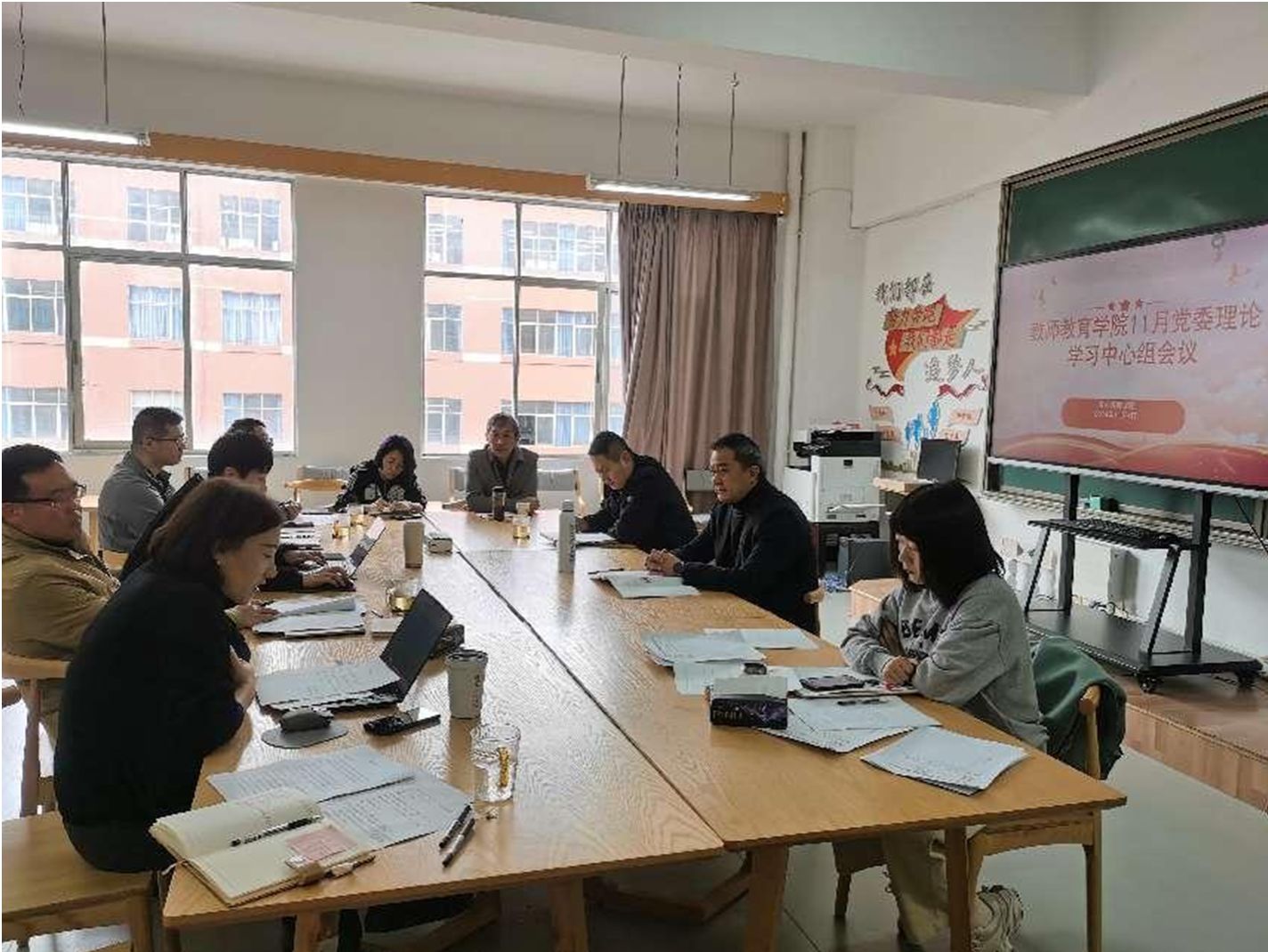 11月4日,教师教育学院党委理论学习中心组学习会议在学院党员活动室召开,学习主题为学习党的二十届三中全会精神及习近平同志《论教育》。段红云校长、办公室副主任陈桢、秘书二科科长普通到会巡听,教师教育学院党委委员、党政班子成员参加会议,会议由学院党委书记莫晓辉主持。