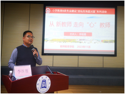 2023年11月9日晚,玉溪聂耳小学教育集团教务主任、云南省国家统编版教材研究项目组玉溪团队核心成员、教师教育学院2005级优秀毕业生李继雁应邀来到教师教育学院,围绕“从新教师到心教师”这一主题,给小学教育专业学生带来了一场精彩绝伦的讲座。本次讲座由周银燕老师主持,2021级小学教育专业的100余名学生参加了讲座。